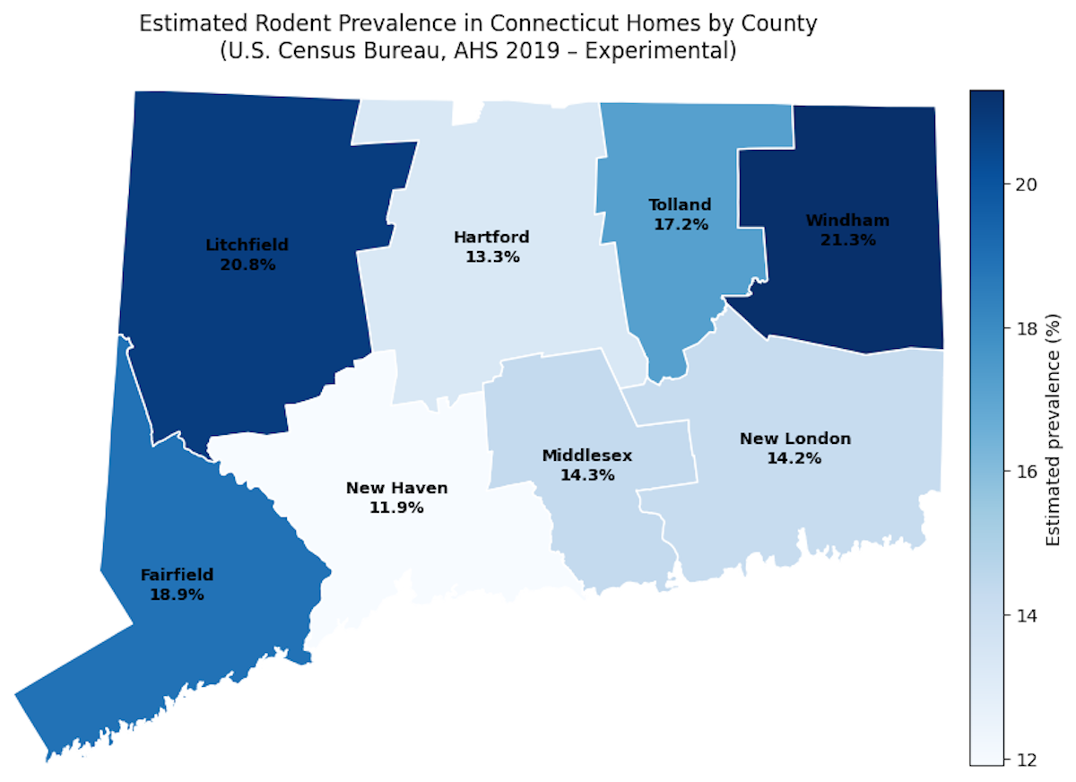 No Connecticut county shows negligible rodent presence in the estimates. Every part of the state registers a meaningful share of households reporting rodent activity over the course of a year.