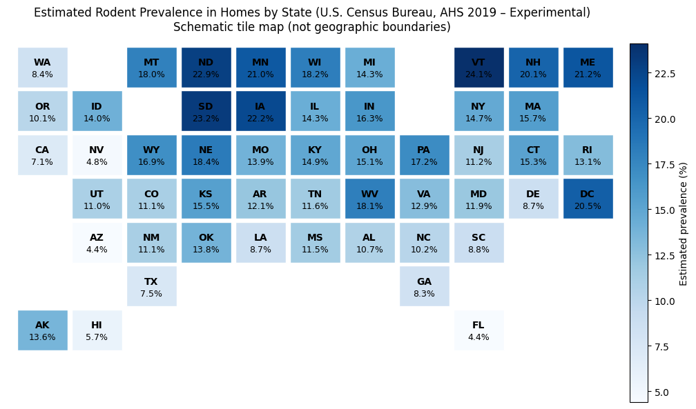 The estimates are based on responses from the American Housing Survey (AHS), a long-running national survey focused on housing conditions. For this analysis, the Census examined whether occupied housing units reported signs of rodents or rodent sightings inside the home during a 12-month period, roughly covering 2018–2019.